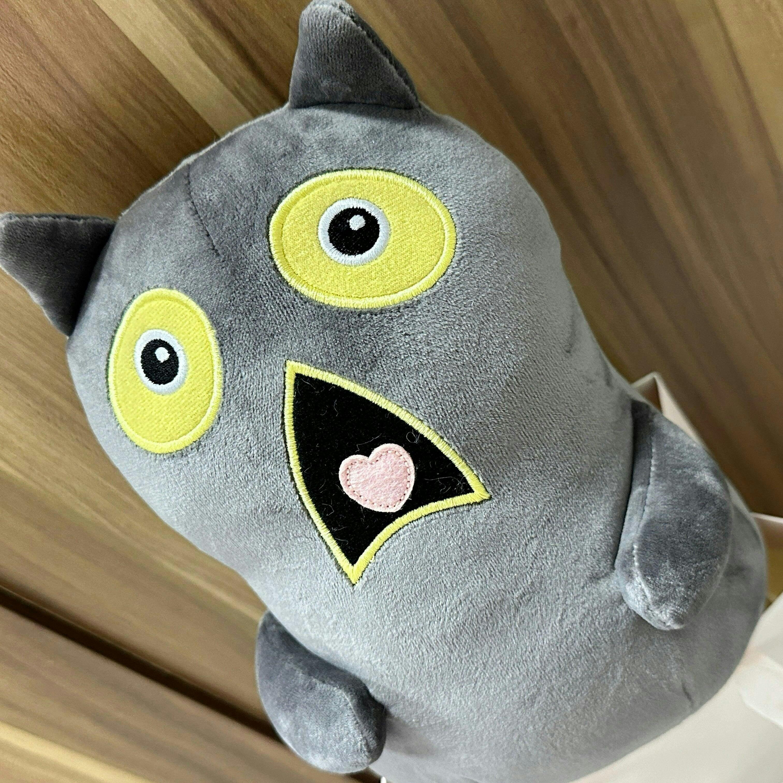 かわいい衝撃的な表情のダークグレーの猫ぬいぐるみ